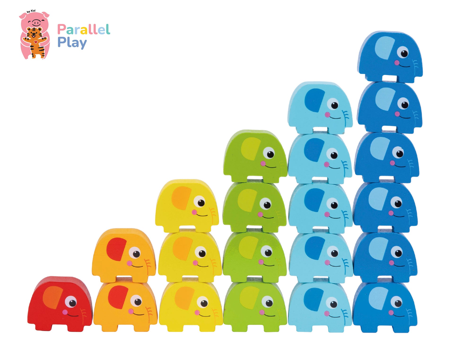 Includes 18 brightly coloured elephant blocks, 6 stacking cards, and 1 colour dice — making every game round exciting and different.