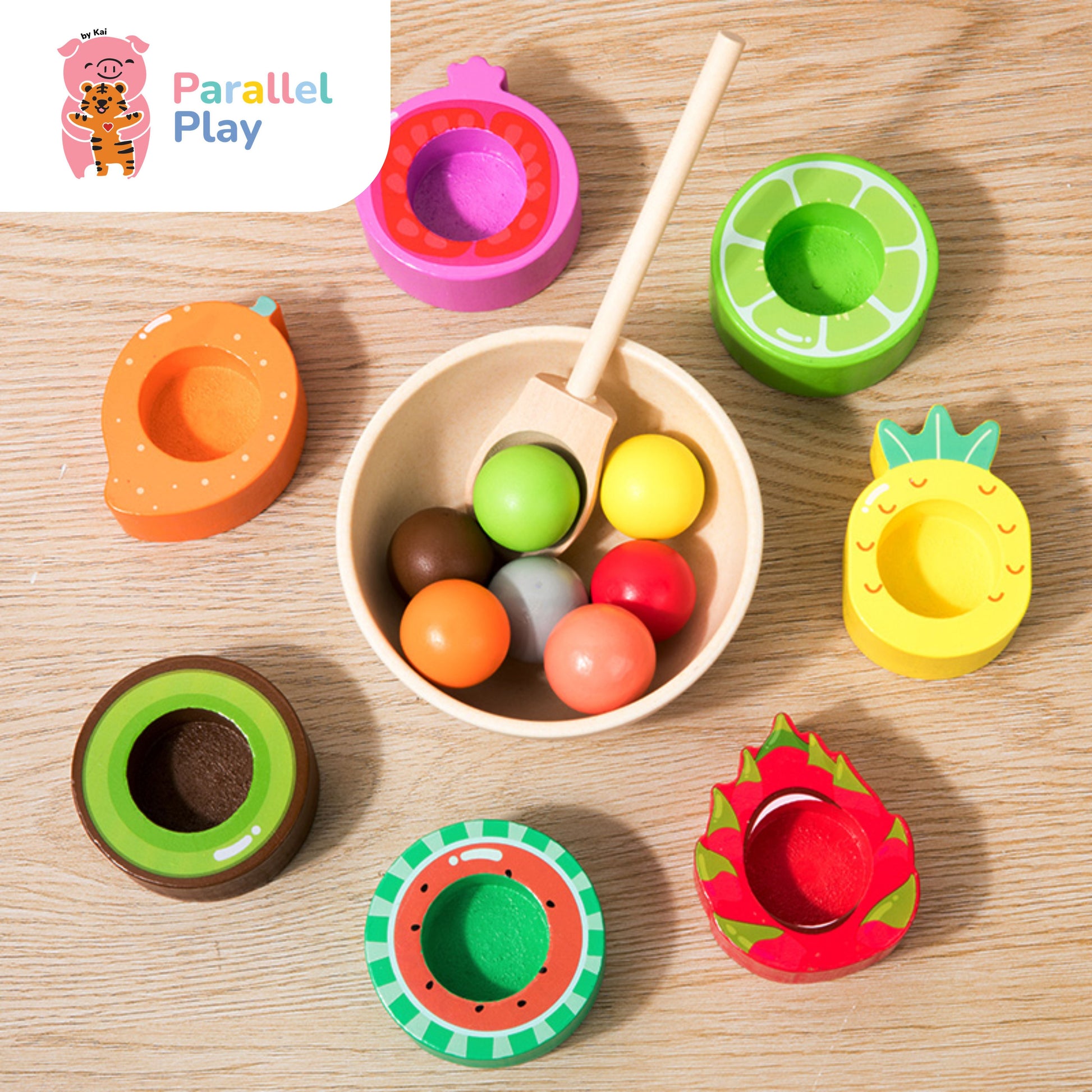 Little ones practise essential Montessori skills by scooping colourful balls and matching them to the correct fruit cups — great for hand-eye coordination and early learning.