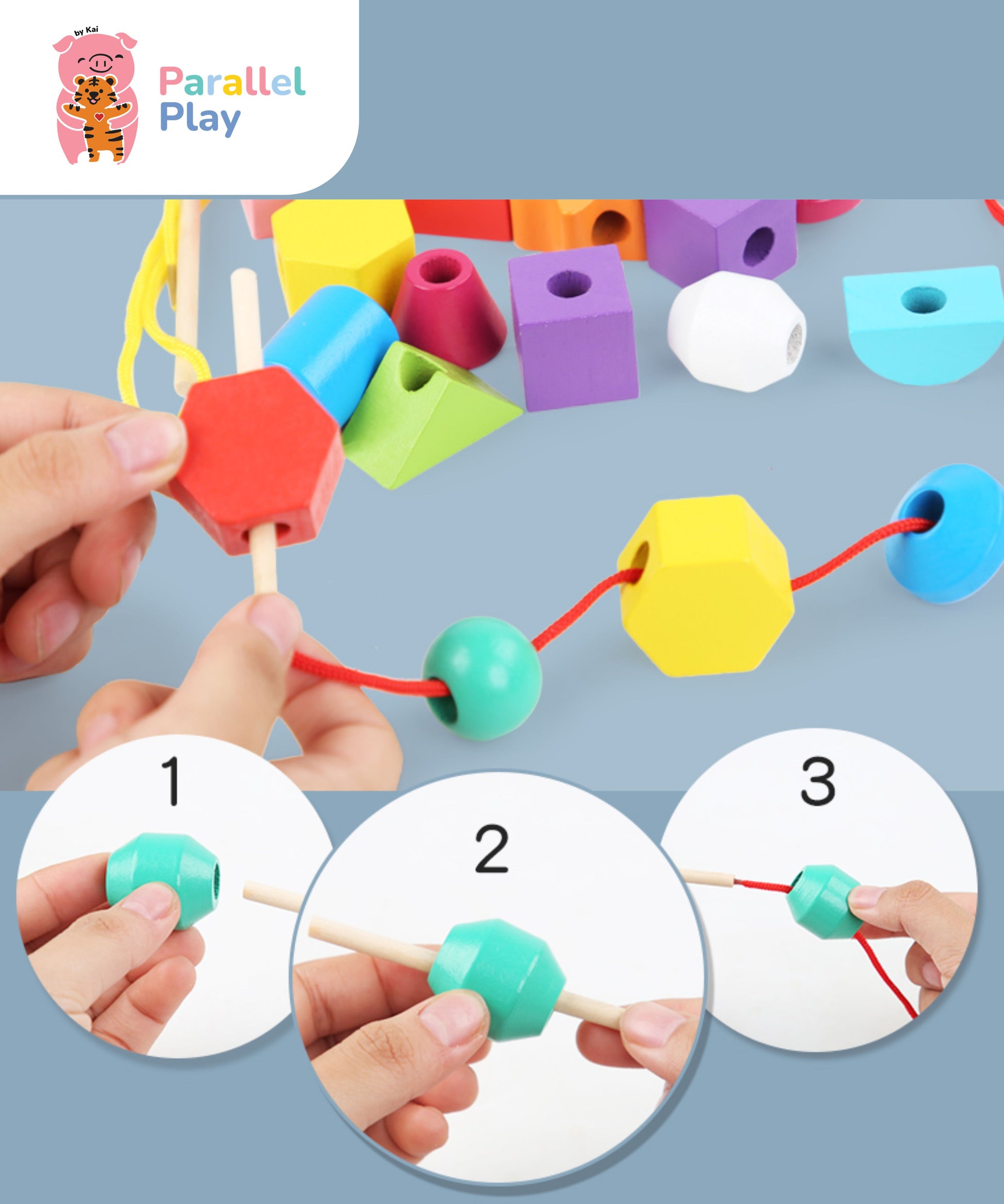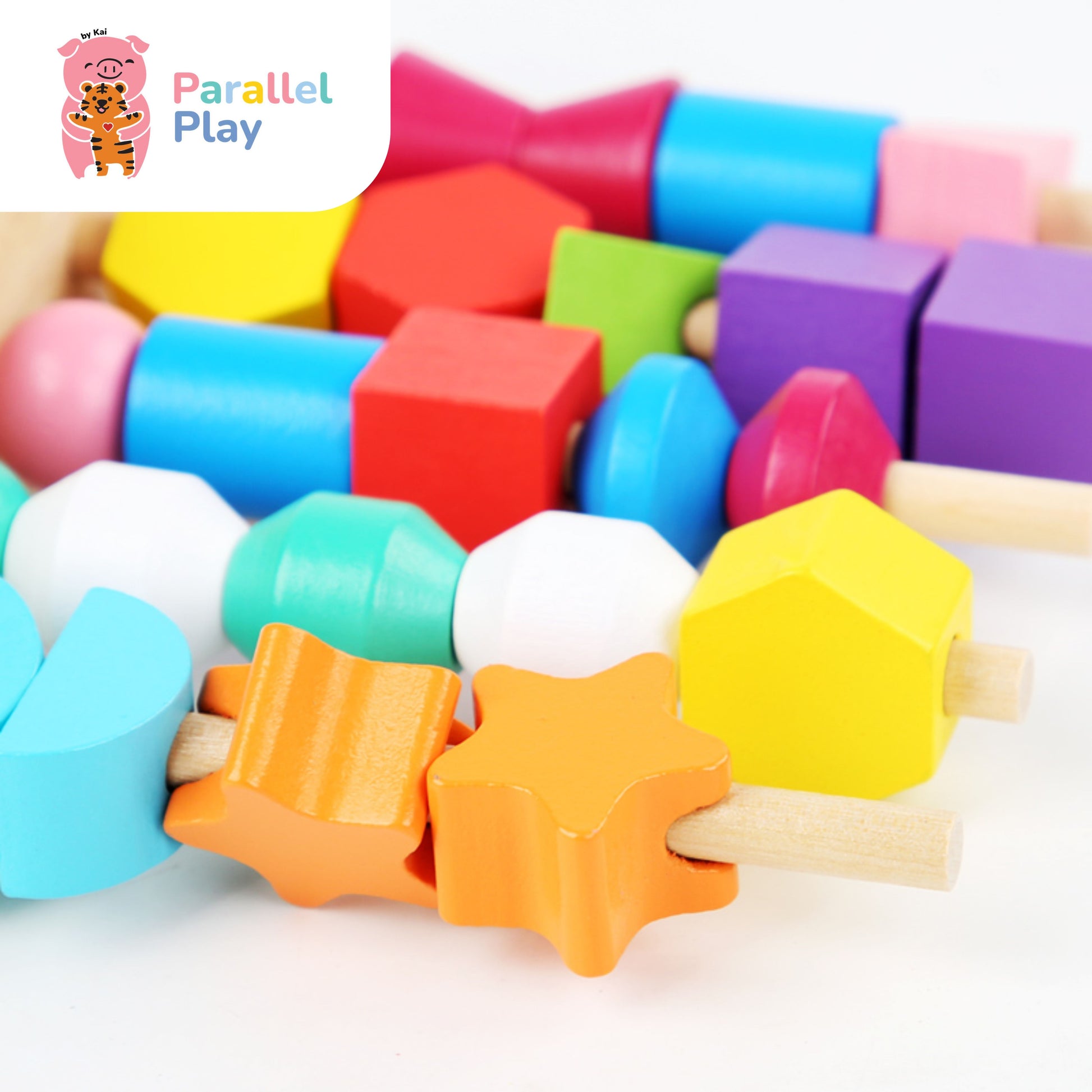 Kids can lace the beads using the string or stack them on the wooden rods to follow pattern cards. Perfect for open-ended, hands-on learning.