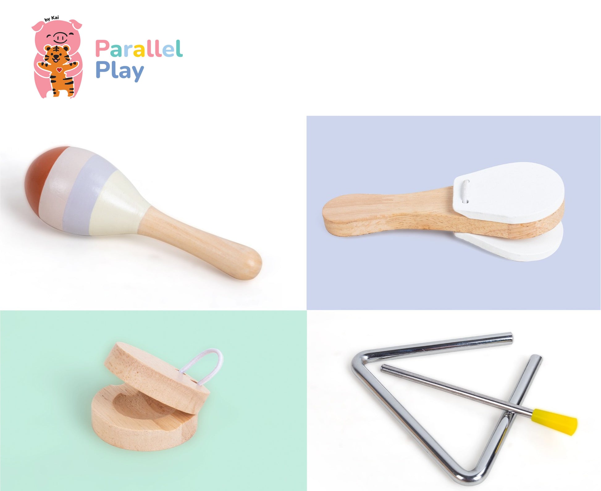 Includes maracas, castanets, a triangle, tambourine, xylophone, rainmaker, and bells — perfect for hands-on learning and early music discovery.