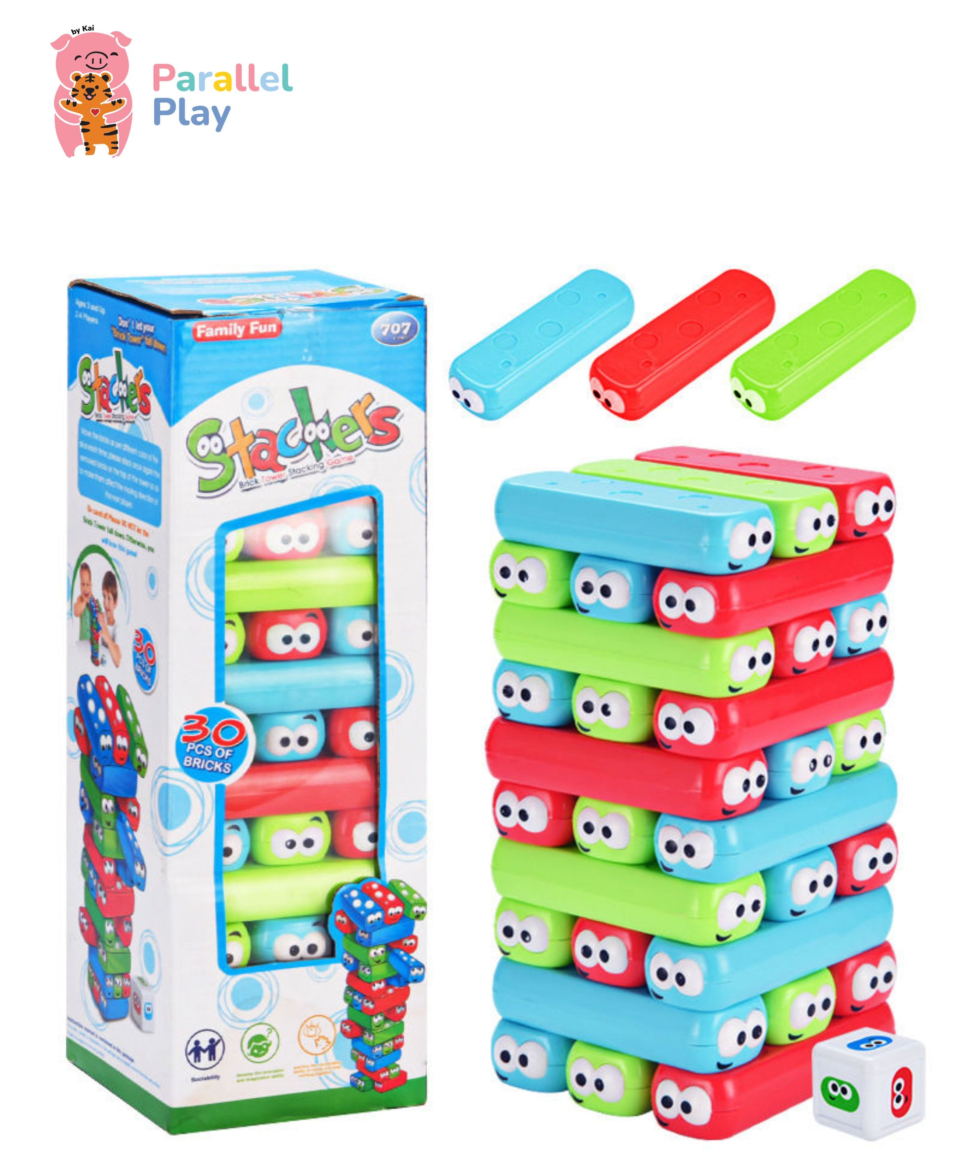 Made from sturdy, child-safe plastic with smooth edges and cheerful faces. Includes 1 colour dice and your choice of 30 blocks — perfect for ages 3 and up, at home or in the classroom! — great for home, classrooms, or family fun time.